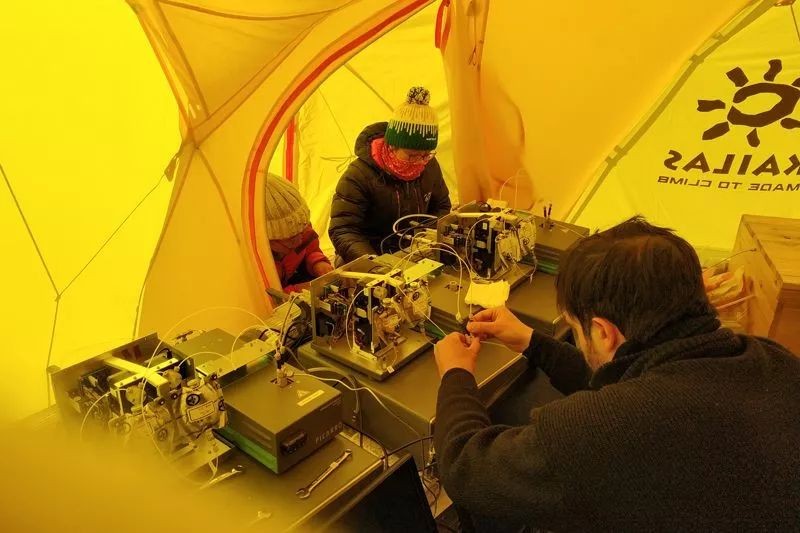 圖:科研人員在珠峰大本營調(diào)試水汽穩(wěn)定同位素觀測儀器