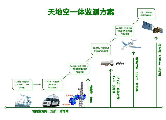 針對不同尺度(全國、省份和城市)碳源匯時空特征進行科學選址、優(yōu)質(zhì)監(jiān)測儀器推薦,構(gòu)建科學合理的由高、中、低精度地基CO2及其它溫室氣體監(jiān)測站網(wǎng),并結(jié)合衛(wèi)星、航空及無人機監(jiān)測,形成“自下而上”大氣反演與“自上而下”物料平衡核算、生態(tài)樣地調(diào)查、生態(tài)衛(wèi)星遙感及生態(tài)系統(tǒng)模型模擬的集成融合立體監(jiān)測與核算體系。