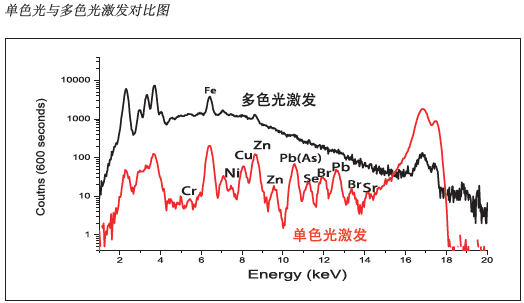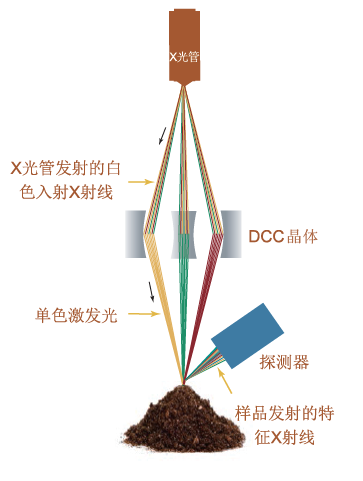 HDXRF®是一種元素分析技術(shù),采用XOS公司研發(fā)的雙曲面彎晶晶體(DCC),提高了測量準(zhǔn)確度;多個(gè)DCC晶體捕獲來自X光管的發(fā)散X射線,并從低到高選擇幾個(gè)特定能量的光束,聚焦成很強(qiáng)的光斑,打在被測樣品表面。HDXRF®分析儀可選擇使用這幾束單色光來激發(fā)樣品,同時(shí)按照應(yīng)用需求有選擇地激發(fā)重金屬污染元素。此外通過單色光的使用,分析儀降低了熒光峰下的背景噪聲,從而改善了檢測下限。下圖顯示了HDXRF®分析儀的基本配置及單色光激發(fā)技術(shù)。