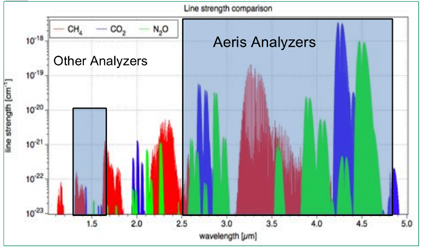 基于中紅外折疊光譜吸收氣體分析技術(shù)Aeris激光氣體分析平臺,將Aeris創(chuàng)新的多通道吸收室與中紅外激光技術(shù)相結(jié)合,檢測室堅(jiān)固小巧且無須高反射鏡,可實(shí)現(xiàn)優(yōu)于ppb級別靈敏度和ppb級準(zhǔn)確度。Aeris平臺在中紅外波段工作,通常氣體分子在中紅外波段吸收比在近紅外光譜強(qiáng)數(shù)千倍。