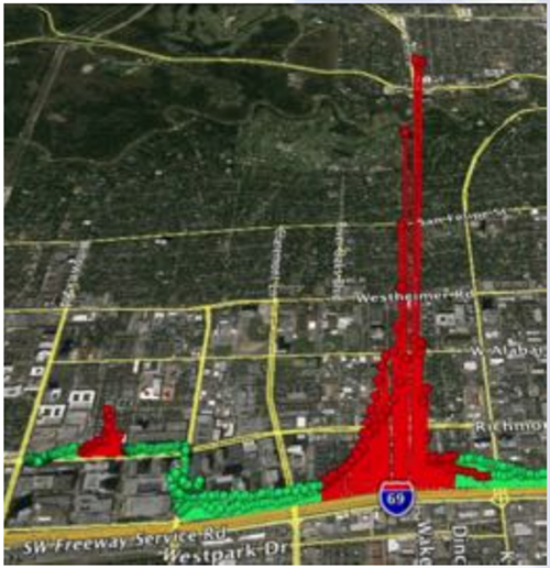 紅色表示休斯頓地區(qū)的乙烷濃度與甲烷濃度高度相關(guān)。檢測車兩次從不同路線通過同一區(qū)域,確定該地區(qū)存在持續(xù)的天然氣泄漏;