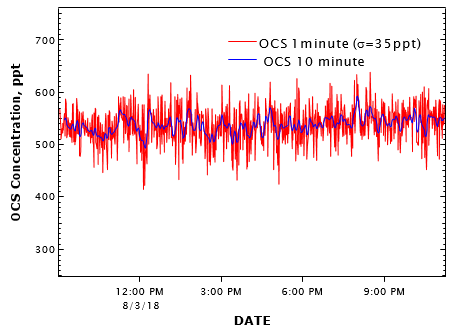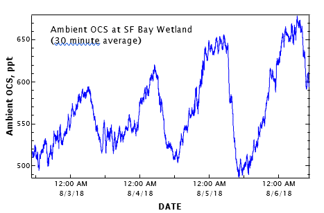 舊金山灣濕地室外OCS濃度進(jìn)行長期自動(dòng)監(jiān)測(cè),使用Pico OCS分析儀對(duì)OCS進(jìn)行長期監(jiān)測(cè),Pico OCS內(nèi)置的周期校準(zhǔn)用戶可自定義校準(zhǔn)間隔,使系統(tǒng)精度得到優(yōu)化。這里,通過30分鐘內(nèi)的信號(hào)平均獲得 10ppt 濃度精度。通過定期校準(zhǔn),基本上減少了儀器長期漂移。從數(shù)據(jù)來看,白天光化學(xué)誘導(dǎo)的OCS吸收循環(huán)非常明顯,這在許多情況下與CO2吸收有關(guān)。